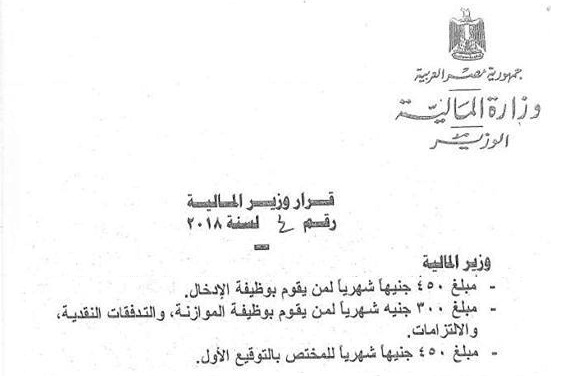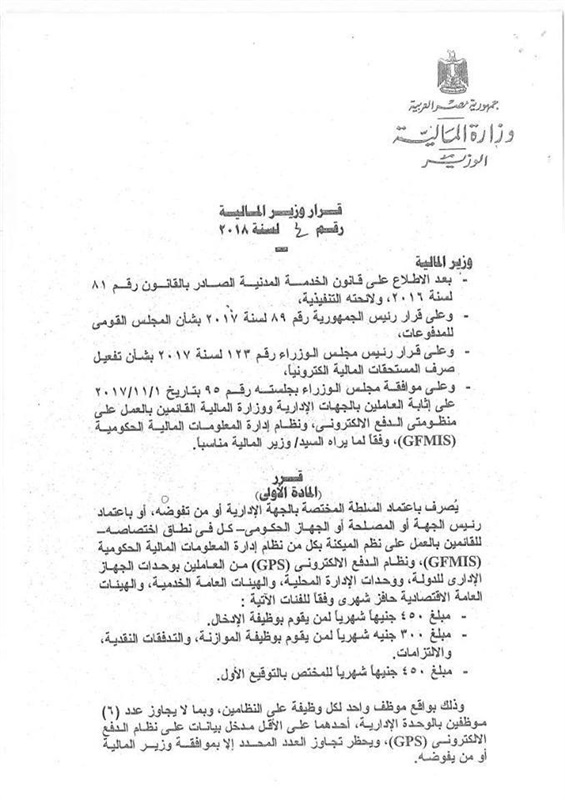 اعلنت وزارة المالية قرار رقم 4 لسنة 2018 الخاص باثابة العاملين بالجهات الادارية والتربية والتعليم ووزارة المالية والقائمين بالعمل على منظومة الدفع الالكترونى ونظام ادارة المعلومات المالية الحكومية للجهات الحكومية المختلفة بالدولة .