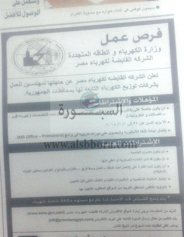 أعلنت الشركة القابضة لكهربا مصر عن حاجتها الى وظائف شاغرة، وعلى الراغبين فى التقدم ارسال السيرة الذاتية عبر الايميل المنشور فى جريدة الأهرام اليوم الجمعة الموافق 13 يناير 2018.