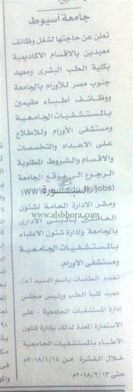 أعلنت جامعة اسيوط عن حاجتها الى معيدين وعلى الراغبين فى التقدم تقديم الطلبات باسم عميد الكلية، علما بان الاعلان منشور فى جريدة الأهرام اليوم الجمعة الموافق 12 يناير 2018.