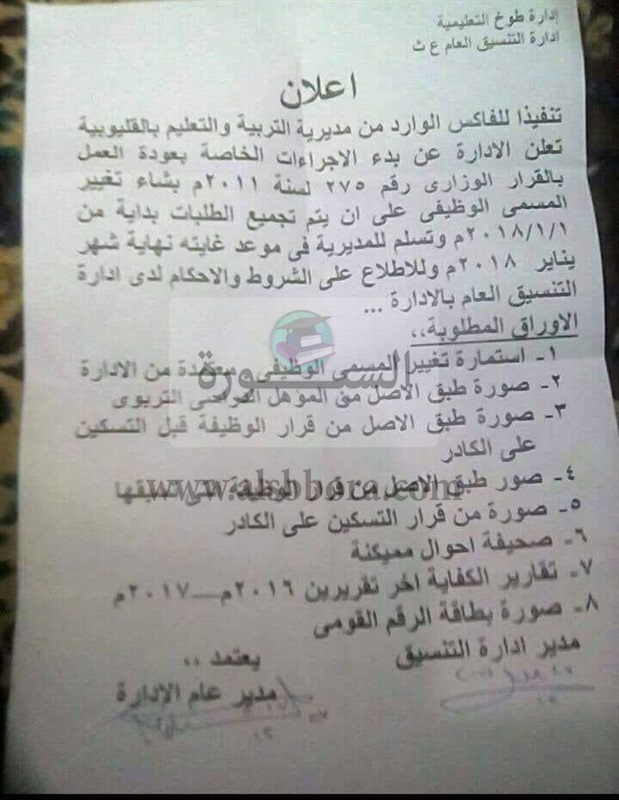 أرسلت مديرية التربية والتعليم بمحافظة القليوبية فاكسا هاما الى جميع الادارات التعليمية بشأن تغيير المسمى الوظيفى للمعلمين والأوراق المطلوبة على أن يكون آخر موعد لتسليم الأوراق نهاية شهر يناير الجارى 2018.