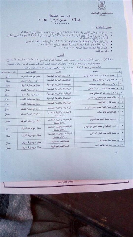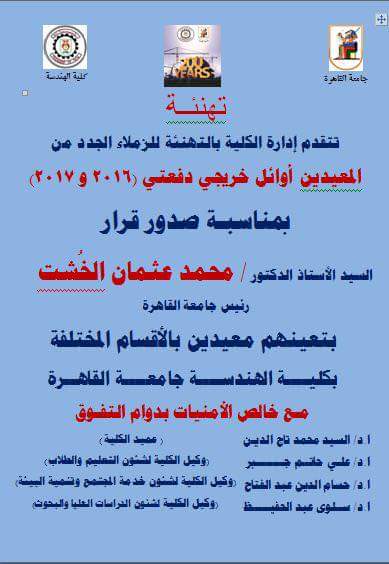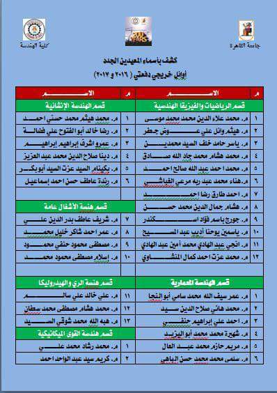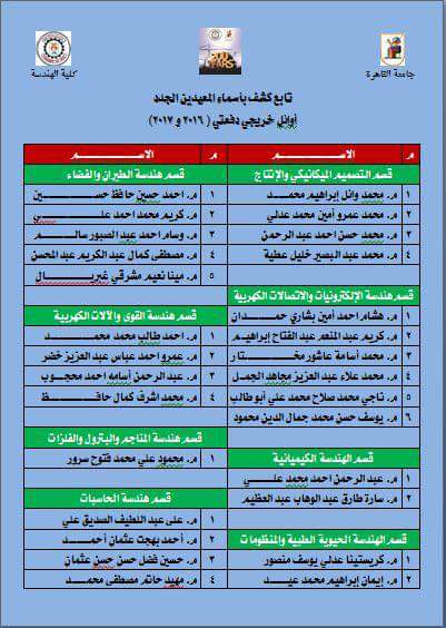 ينشر موقع السبورة أسماء المعيدين الجدد بكلية الهندسة جامعة القاهرة بقرار رقم 19 بتاريخ اليوم 16 يناير 2018/ وجاءت الاسماء كالتالى: