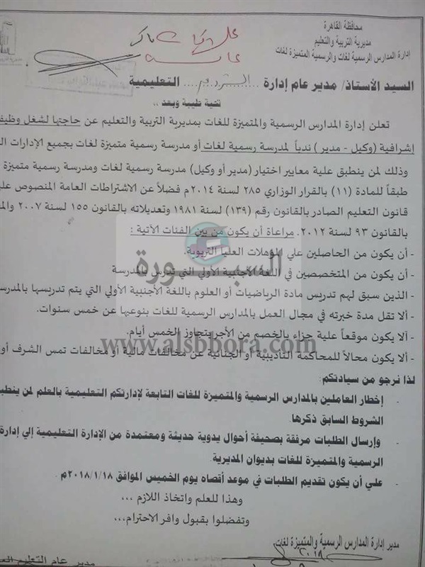 أعلنت إدارة المدارس الرسمية والتميزة لغات بمديرية التربية والتعليم بالقاهرة عن حاجتها لمديرين ووكلاء للمدراس الرسمية والمتميزة لغات بجميع إدارات القاهرة التعليمية