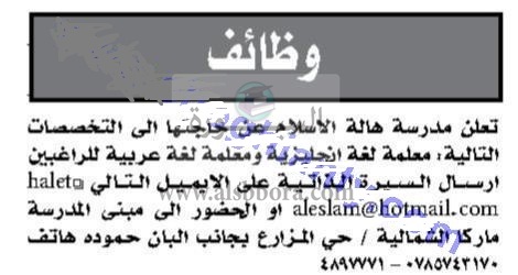 تعلن مدرسة هالة الإسلام بالاردن عن حاجتها الى معلمات وذلك وفقا لنص الإعلان التالى: