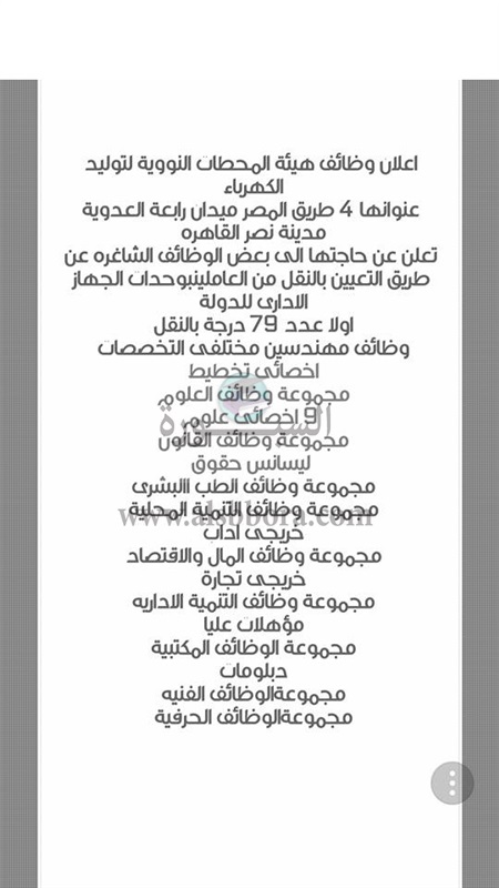 أعلنت وزارة الكهرباء والطاقة المتجددة، عن وظائف لهيئة المحطات النووية بالضبعة، لتوليد الكهرباء، لحاجة الشركة لبعض الوظائف الشاغرة عن طريق التعيين بالنقل من العاملين بوحدات الجهاز الإداري بالدولة.