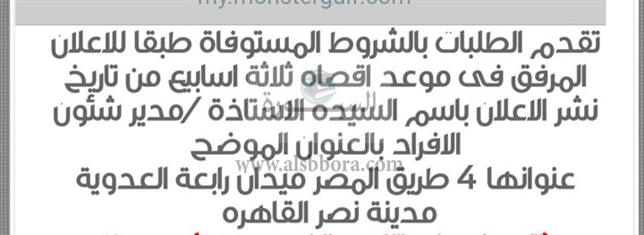وتقدم الطلبات بالشروط المستوفاة العنوان: 4 طريق النصر، ميدان الشهيد هشام بركات، رابعة العدوية سابقًا، مدينة نصر القاهرة.