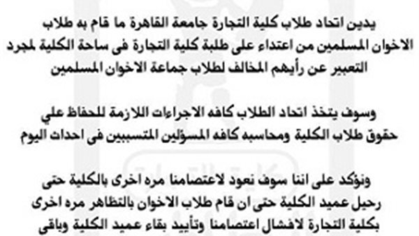 ومحاسبة كافة المسؤلين المتسببن في الاحداث ... اشار البيان سوف نعود لاعتصامنا مرة اخري حتي لو قام طلاب الاخوان لافشال اعتصامنا وتأييد بقاء العميد وباقي الاساتذة الاخوان كما حدث امس ...ناشد الاتحاد جميع الطلاب عدم التخلي عن مطالبهم ..تنشر السبورة نص البيان
