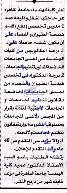 تعلن جامعة القاهرة عن حاجتها الى أعضاء هيئة التدريس، وعلى الراغبين فى الحصول على الوظيفة تقديم الطلبات باسم عميد الكلية فى موعد غايته شهر من تاريخ النشر والذى تم نشره اليوم الجمعة فى جريدة الأهرام بتاريخ 19 يناير 2018.
