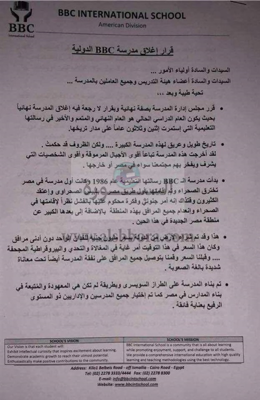 كشف مجلس إدارة مدرسة BBC الدولية الكائنة بطريق مصر - بلبيس الصحراوي- ، في بيان هام أصدره عن إغلاق المدرسة بشكل نهائي، مشيرا إلي أن العام الدراسي الجاري سوف يكون هو العام الأخير والنهائي للعمل بالمدرسة.