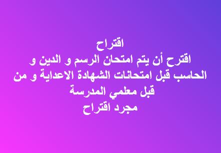 دشن نشطاء التعليم على موقع التواصل الاجتماعى "فيسبوك" اقتراحا بان يتم امتحان الرسم والدين والحاسب الآلى قبل امتحانات الشهادة الاعدادية ومن قبل معلمى المدرسة، وليست اثناء امتحانات النظرى التابع لمديريات التربية والتعليم على مستوى المحافظات.