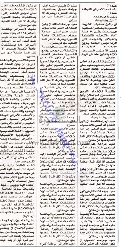 تعلن جامعة المنصورة عن حاجتها الى معيدين فى العديد من الوظائف فى الجامعة فى 26 تخصصا، وعلى الراغبين فى التقدم تقديم الطلبات باليد باسم عميد الكلية فى موعد غايته 15 يوما من تاريخ نشر الاعلان والذى تم نشره اليوم السبت فى جريدة أخبار اليوم.
