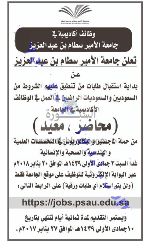 تعلن جامعة الأمير بسطام بن عبدالعزيز عن حاجتها الى معيدين وأعضاء هيئة التدريس، وعلى الراغبين فى التقدم الدخول على موقع الجامعة بداية من اليوم السبت الموافق 20 يناير حنى 27 يناير الجارى.