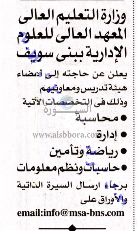 يعلن المعهد العالى للعلوم الادارية ببنى سويف التابع لوزارة التعليم العالى عن حاجته الى أعضاء هيئة التدريس فى 4 تخصصات وعلى الراغبين فى التقدم ارسال السيرة الذاتية على الايميل المنشور فى اعلان جريدة الأهرام.