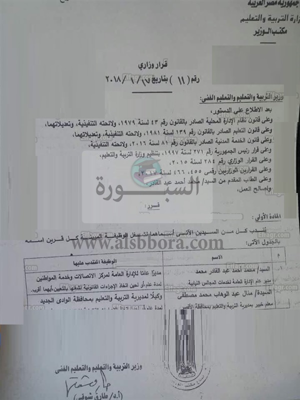 وبحسب البيان الذي صدر عن الوزارة وتداوله رواد مواقع التواصل الاجتماعي "فيسبوك"، فقد نص القرار على ندب محمد أحمد عبد القادر وكيل مديرية الوادي الجديد التعليمية لوظيفة مدير عام الإدارة العامة لمركز الاتصالات وخدمة المواطنين بديوان عام الوزارة.