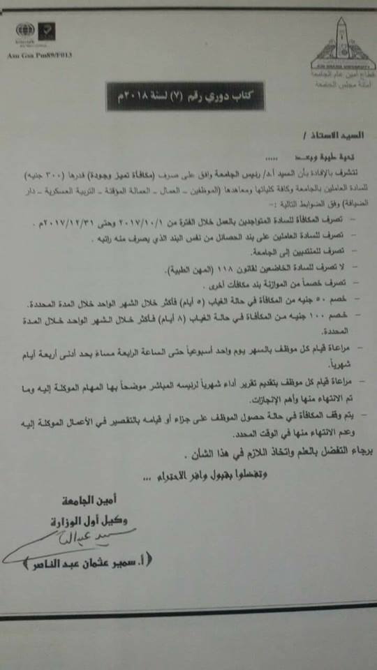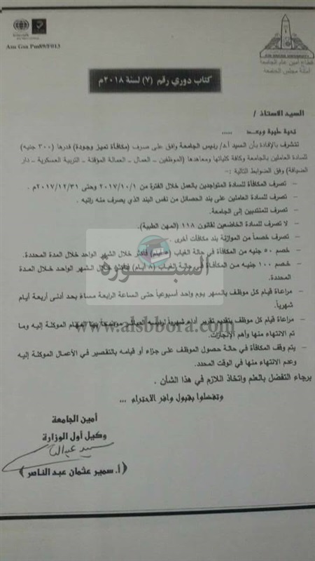 وافق الدكتور عبدالوهاب عزت رئيس جامعة عين شمس، وسمير سيد وكيل اول وزارة وامين عام الجامعة، واشرف سعيد مدير عام الحسابات الخاصة، على صرف 300 جنيه مكافأة حافز تميز جودة للموظفين المتميزين بالجامعة، لتحفيز العاملين على العمل، ولهذه المكافأة شروط :