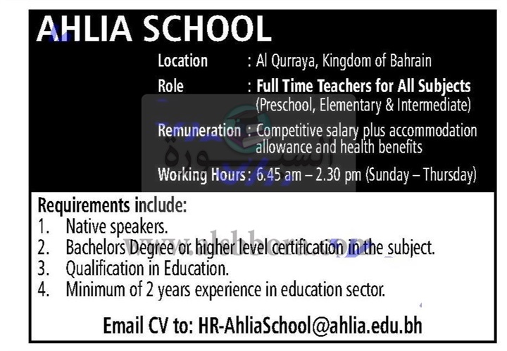 تعلن المدرسة الأهلية البحرينية عن وظائف جديدة للمعلمين والمعلمات في جميع المواد وذلك وفقا لنص الإعلان التالي: