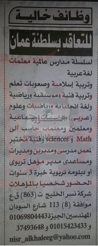 تعلن سلطنة عمان عن حاجتها الى وظائف للمدرسين والمدرسات، وعلى الراغبين فى التقدم ارسال السيرة الذاتية عبر الايميل المنشور فى جريدة الأهرام.