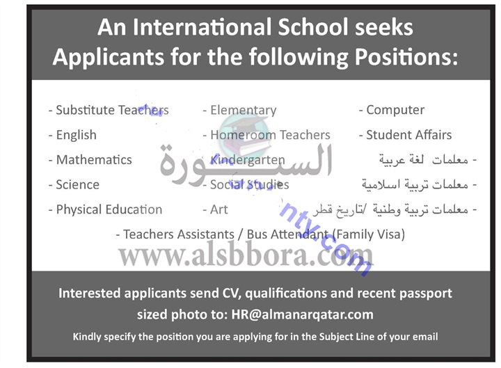 تعلن قطر عن حاجتها الى وظائف معلمين ، وعلى الراغبين فى التقدم ارسال السيرة الذاتية عبر الايميل المنشور .