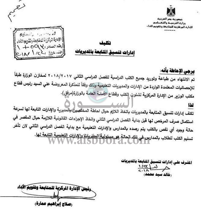 ارسلت الادارة المركزية للمتابعة وتقويم الاداء بوزارة التربية والتعليم ، خطابا رسميا لجميع المديريات التعليمية ، يفيد بأنه تم الانتهاء من طباعة وتوريد جميع الكتب المدرسية الخاصة بالفصل الدراسي الثاني من العام الدراسي 2017/2018، الى مخازن الوزارة.