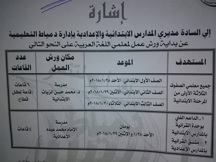 ارسلت مديرية التربية والتعليم بدمياط باشارة الى مديرى المدارس الابتدائية والاعدادية والتى جاءت كالتالى: