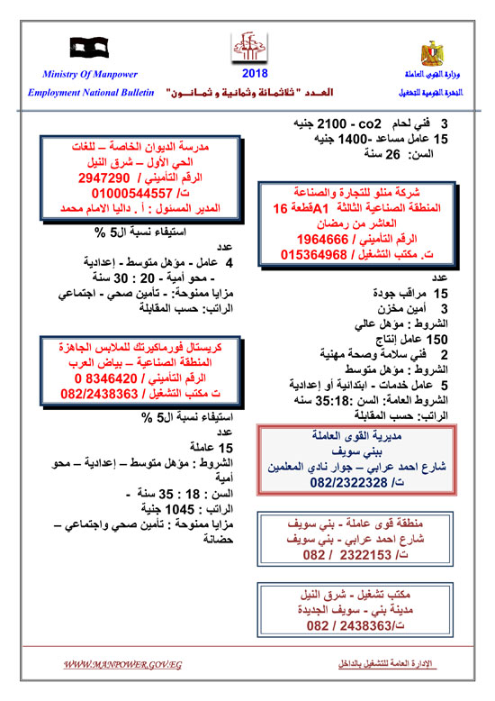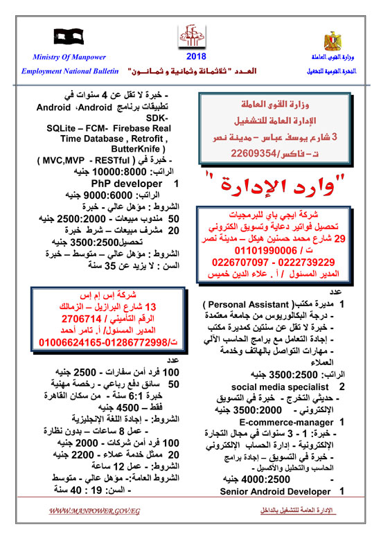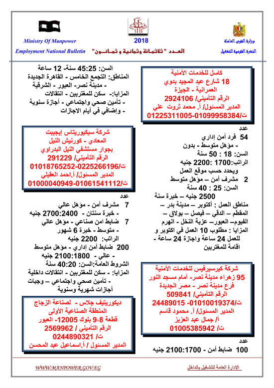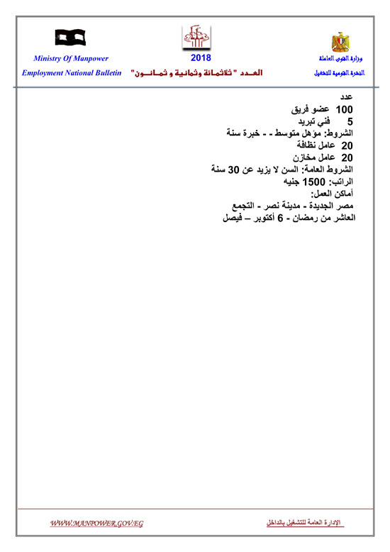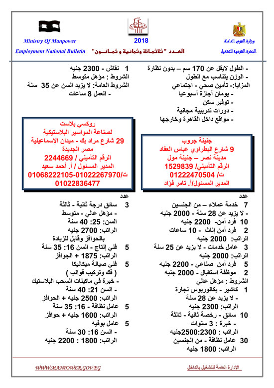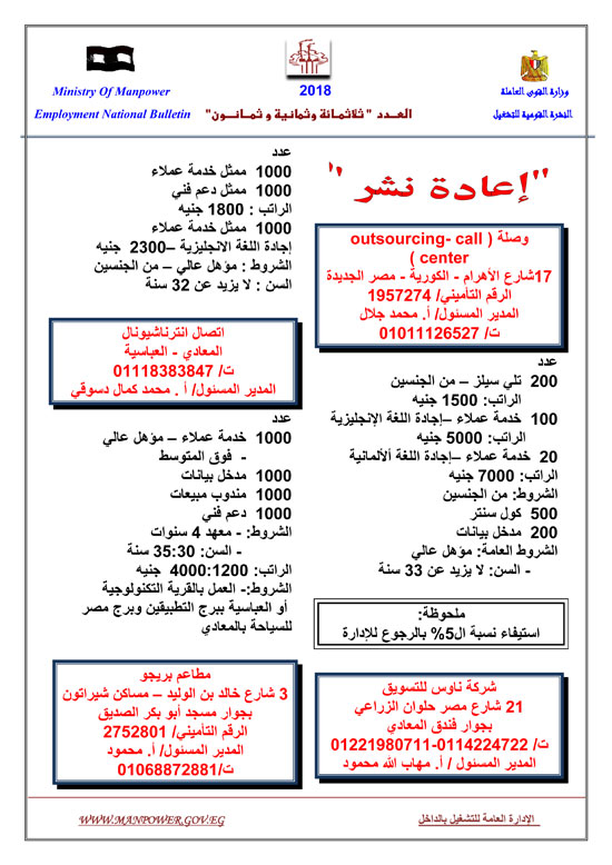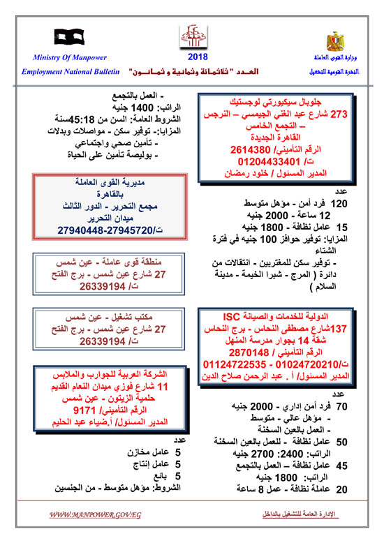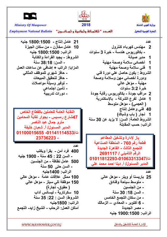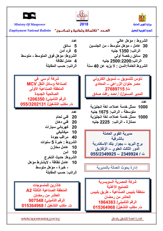 أعلنت وزارة القوى العاملة عن إتاحة 5545 فرصة عمل حتى نهاية شهر فبراير 2018، وفقا للنشرة القومية للتشغيل.