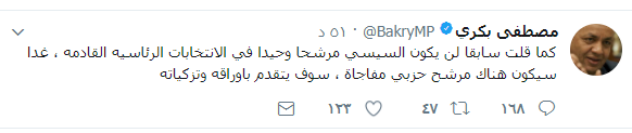 وكتب " بكرى" فى تغريدة له على موقع التدوينات المصغرة " تويتر": "كما قلت سابقا لن يكون السيسي مرشحا وحيدا في الانتخابات الرئاسيه القادمه، غدا سيكون هناك مرشح حزبى مفاجأة، سوف يتقدم باوراقه وتزكياته".