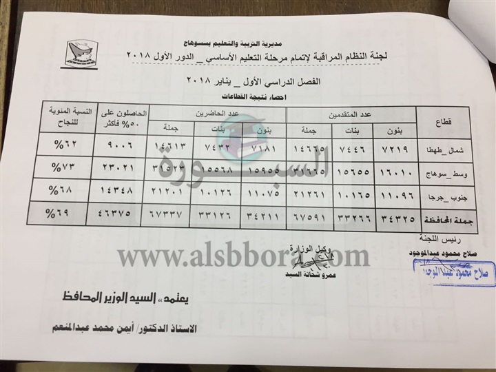 محافظ سوهاج يعتمد نتيجة الشهادة الإعدادية بنسبة نجاح 69%