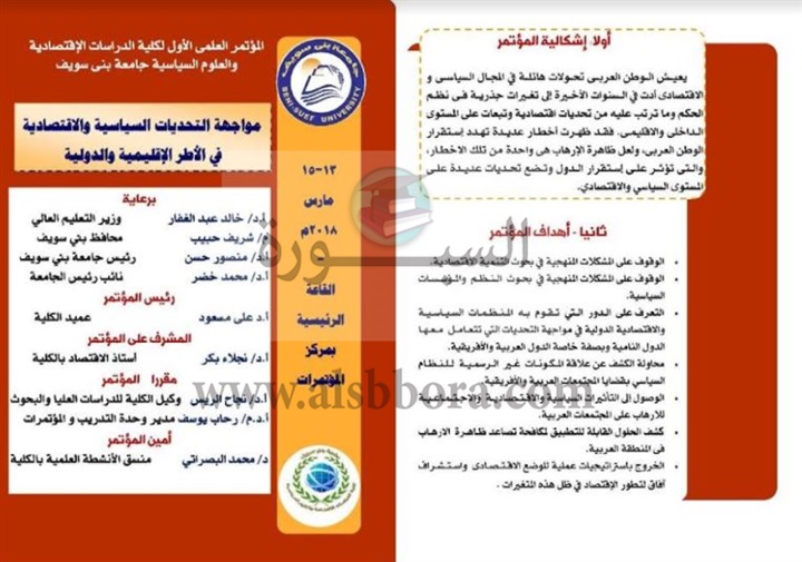 تحت رعاية الدكتور خالد عبد الغفار وزير التعليم العالي والمهندس شريف حبيب محافظ بني سويف والدكتور منصور حسن رئيس جامعة بني سويف والدكتور محمد خضر نائب رئيس الجامعة المؤتمر العلمى الأول لكلية الدراسات الإقتصادية والعلوم السياسية بجامعة بنى سويف بعنوان “مواجهة التحديات السياسية والاقتصادية في الأطر الإقليمية والدولية “فى الفترة 13-15مارس بالقاعة الرئيسية بمركز المؤتمرات .