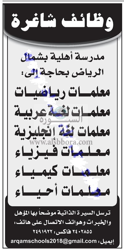 أعلنت مدرسة أهلية بشمال الرياض عن وظائف جديدة للمعلمين وفقا لنص الإعلان التالي: