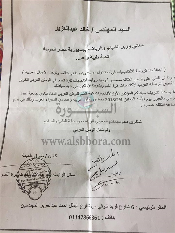 وجهت الرابطة العربية للاكاديميات كرة القدم برئاسة طارق طعيمة نجم الكرة العراقية السابق، الدعوة الى المهندس خالد عبدالعزيز وزير الدولة لشئون الشباب والرياضة، لحضور المؤتمر الأول لأكاديميات كرة القدم للوطن العربي، غدا الأحد.