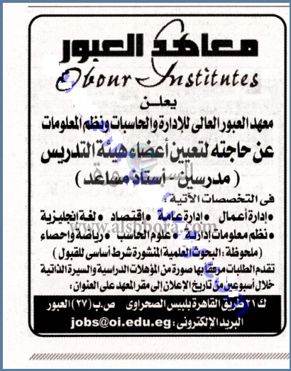 يعلن معهد العبور العالى للادارة والحاسبات ونظم المعلومات عن حاجته لتعيين أعضاء هيئة التدريس "مدرسين - استاذ مساعد"، وعلى الراغبين فى التقدم ارسال السيرة الذاتية عبر الايميل المنشور فى اعلان جريدة الجمهورية.