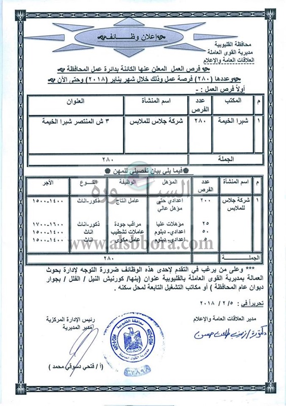 أعلنت مديرية القوى العاملة بمحافظة القليوبية عن توفير 380 فرصة عمل للشباب من خريجى الجامعات وحملة المؤهلات المتوسطة والاعدادية، وذلك على نحو الاعلان المنشور كالتالى: