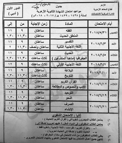 كما اقترحت الإدارة المركزية للامتحانات أنْ تبدأَ امتحانات القسم الأدبى، الخميسَ 31 مايو 2018، بمادّتَى الفقه، والمنطق الحديث، على أنْ تنتهى الاختبارات 21 يونيو 2018، بمادّتَى الصرف، والإنشاء.