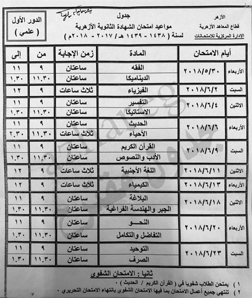 واقترحت الإدارة المركزية للامتحانات؛ أن تبدأ امتحانات القسم العلمى الأربعاءَ 30 مايو 2018، بمادّتَى: الفقه، والميكانيكا، على أن تنتهى الاختبارات السبتَ 23 يونيو 2018، بمادّتَى التوحيد، والصرف.