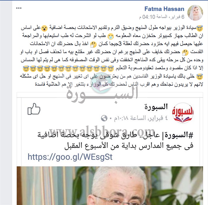 "اخذ بال حضرتك ان الامتحانات اتقدمت حضرتك خايف على المنهج برغم ان حضرتك غير مقتنع بيه ما تحذف فصل او باب او وحده من كل مرحله يبقى كده المناهج اتخففت وفى نفس الوقت المصفوفه كما هى لم يتم لها المساس إلا اذا كان مقصود ومتعمد تعقيدوصعوبة التعليم خلى بالك ياسيادة الوزير الفاسدين هم من يعترضون على اى تغيير فى المنهج او حل اى مشكله لانهم لا يريدون نجاحك وهم اقرب الناس لحضرتك كل الوزارء بتتغير إلا هم الحاشية فاسدة."