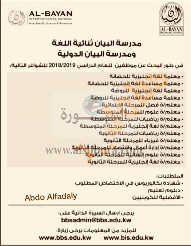 تعلن مدارس البيان الكويتية عن وظائف جديدة للمعلمين والمعلمات وذلك وفقا لنص الإعلان التالي: