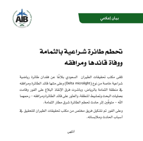 اعلن مكتب تحقيقات الطيران السعودى عن فقدان طائرة رياضية شراعية خاصة من نوع (Delta microlight) وعلى متنها قائد الطائرة ومرافقه فى منطقة الثمامة بالرياض.