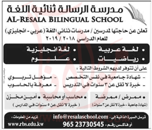 اعلنت مدرسة الرسالة ثنائية اللغة بالكويت عن حاجتها لشغل عدد من الوظائف المطلوبة وفقا للاعلان الرسمى المنشور اليوم والذى جاء على النحو التالى وفقا للتخصصات المطلوبة للمعلمين والمعلمات والذى جاءت على النحو التالى :