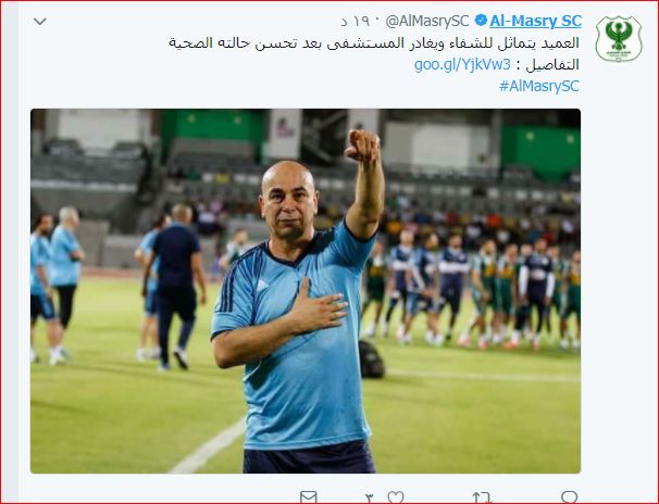 وأشار النادى المصرى عبر صفحته الرسمية :"أن الكابتن حسام حسن المدير الفنى للفريق الأول للكرة للنادى المصرى احتجز فى إحدى المستشفيات الخاصة بعد إصابته بنزلة برد وإجهاد وارتفاع بدرجة الحرارة، وأمر الطبيب المعالج بخروجه بعد تحسن حالته".