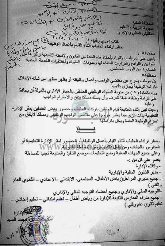 ينشر موقع السبورة الكتاب الدورى رقم 11 لسنة 2014 بشأن حظر ارتداء الجلباب اثناء القيام بأعمال الوظيفة فى المدارس.