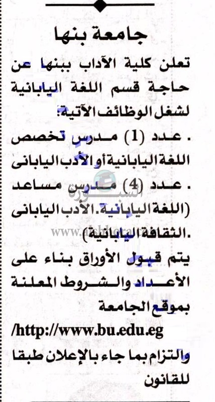 تعلن جامعة بنها عن وظائف جديدة لأعضاء هيئة التدريس"من حملة الماجستير والدكتوراه" وذلك وفقا لنص الإعلان التالي:-