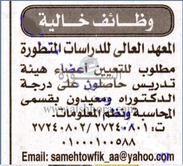 يعلن المعهد العالى للدراسات المتطورة عن حاجته الى أعضاء هيئة التدريس من الحالسفين على درجة الدكتوراة، بالاضافة الى معيدين بقسمى المحاسبة ونظم المعلومات، وعلى الراغبين فى التقدم ارسال السيرة الذاتية عبر الايميل المنشور فى اعلان جريدة الأخبار المنشور اليوم الأربعاء الموافق 14 فبراير 2018.