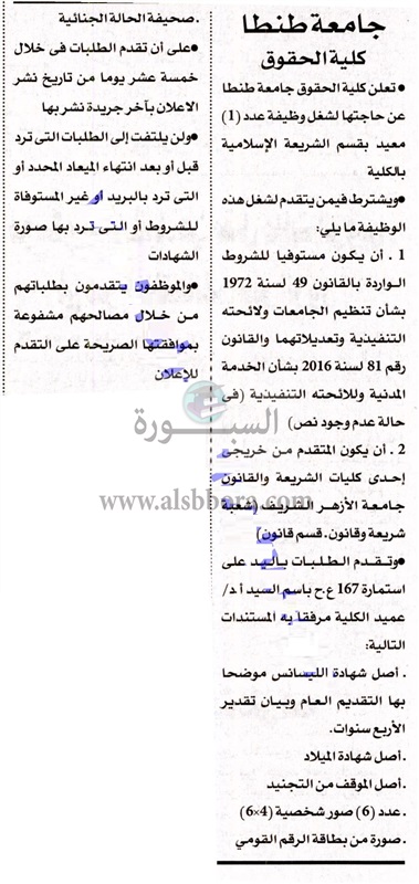 تعلن جامعة طنطا عن وظائف جديدة لأعضاء هيئة التدريس"من حملة الماجستير والدكتوراة" وذلك وفقا لنص الإعلان التالي:-