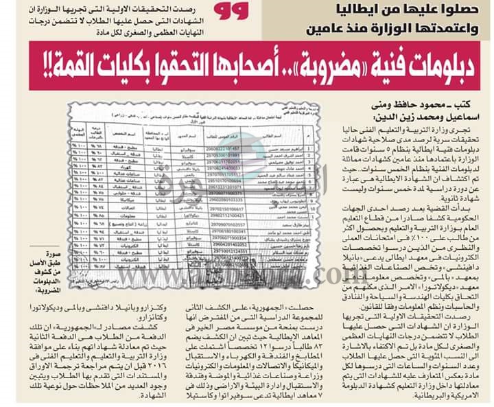 فجرت جريدة الجمهورية فضيحة من العيار الثقيل، حيث تمكن بعض الطلاب من الحاصلين على دروات تدريبية من الدول الأوروبية وخاصة من ايطاليا فى الالتحاق بكليات القمة، وتجرى وزارة التربية والتعليم تحقيقيا فى هذا الموضوع ومدى صحته.