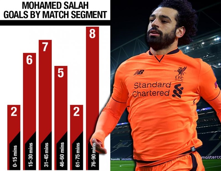 نشر موقع ليفربول الانجليزى اوقات الأهداف التى احرزها صلاح على مدار الـ 90 دقيقة فى المباريات الـ 36 التى شارك مع الريدز فى جميع المسابقات، والتى أحرز خلالها 30 هدفا.