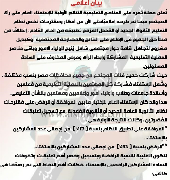 هذا وقد كان الإستفتاء العام للإختيار ما بين الموافقة أو الرفض على مُقترحات نظام الثانوية العامة الجديد أو الثانوية المُعدلة مع تسجيل تعليقات المُصَوتين ،وكانت النتيجة الأولية هى :