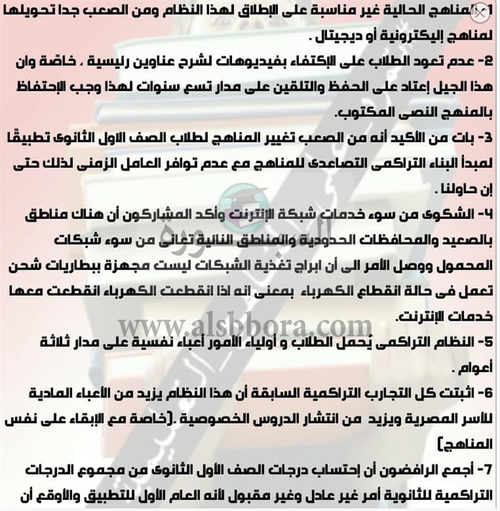 7_أجمع الرافضون أن إحتساب درجات الصف الأول الثانوى من مجموع الدرجات التراكمية للثانوية أمر غير عادل وغير مقبول لأنه العام الأول للتطبيق والأوقع أن يحتسب العامين الاول والثانى الثانوى كأعوام للتدريب على النظام وتقييم مدى تطبيقة كنظام نهائى للثانوية العامة .