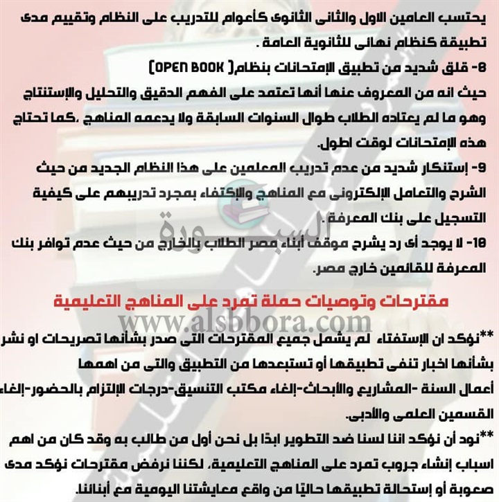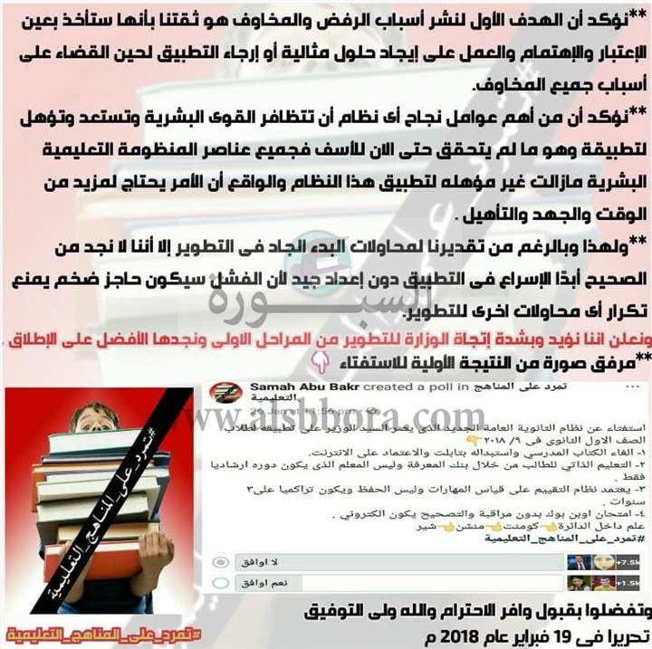 **نود أن نؤكد اننا لسنا ضد التطوير ابدًا بل نحن أول من طالب به وقد كان من اهم اسباب إنشاء جروب تمرد على المناهج التعليمية، لكننا نرفض مقترحات نؤكد مدى صعوبة أو إستحالة تطبيقها حاليًا من واقع معايشتنا اليومية مع أبنائنا.