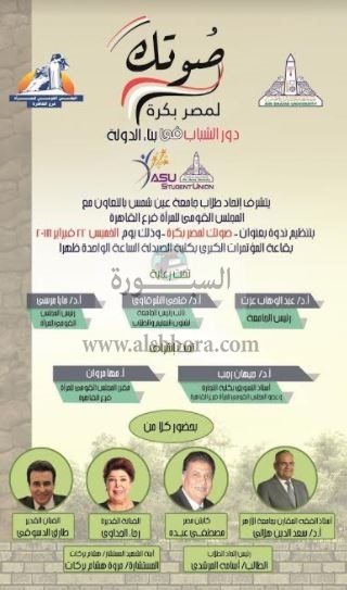 تنظم جامعة عين شمس و إتحاد طلاب الجامعة بالتعاون مع المجلس القومى للمرأة ندوة بعنوان"صوتك لمصر بكرة " و ذلك تحت رعاية عبد الوهاب عزت رئيس الجامعة وفتحى الشرقاوي نائب رئيس الجامعة لشئون التعليم ومايا مرسى رئيس المجلس القومى للمرأة وتحت إشراف جيهان رجب الاستاذ بكلية التجارة وعضو المجلس القومى للمرأة ومها مروان مقرر المجلس القومى للمرأة.