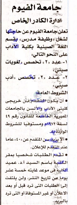 تعلن جامعة الفيوم عن حاجتها الى أعضاء هيئة التدريس، وعلى الراغبين فى التقدم تقديم الطلبات شخصيا بمقر الكلية فى موعد غايته خمسة عشر يوما من تاريخ النشر والذى تم نشره فى جريدة الأخبار اليوم الأربعاء الموافق 21 فبراير 2018.