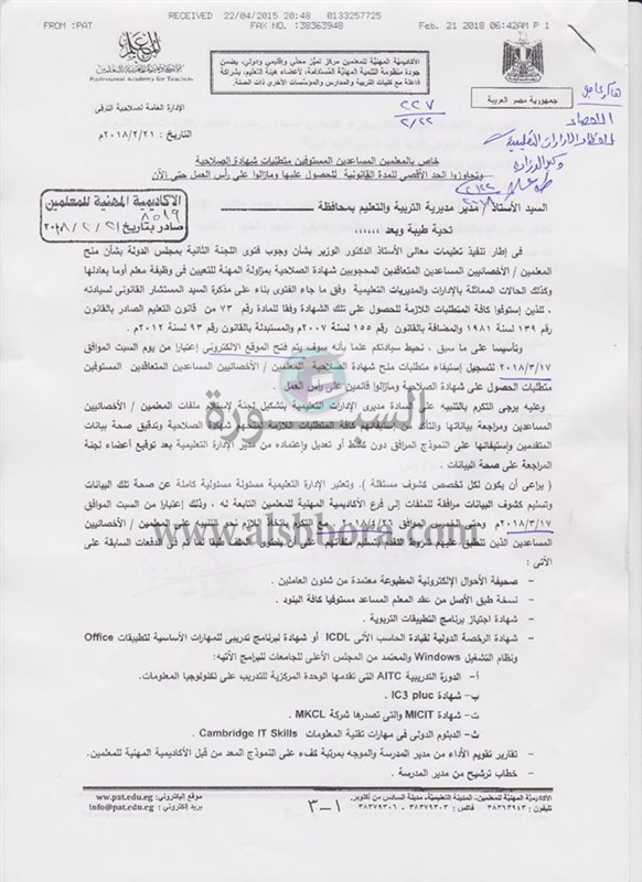 اعلنت الاكاديمية المهنية للمعلمين عن فتح الموقع الالكتروني لتسجيل المعلمين المساعدين المستوفين متطلبات شهادة الصلاحية وتجاوزا الحد الأقصى للمدة القانونية للحصول عليها ومازالوا علي راس العمل حتي الان والصادر بشأنهم فتوي مجلس الدولة " الأسماء التي كانت محجوبة " خلال الفترة من 17-3-2018 الي 26-4-2018 م ليتسنى بعد ذلك صدور قرار من السيد وزير التربية والتعليم بتسكينهم علي درجة معلم .